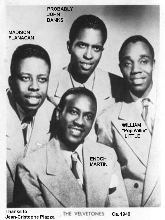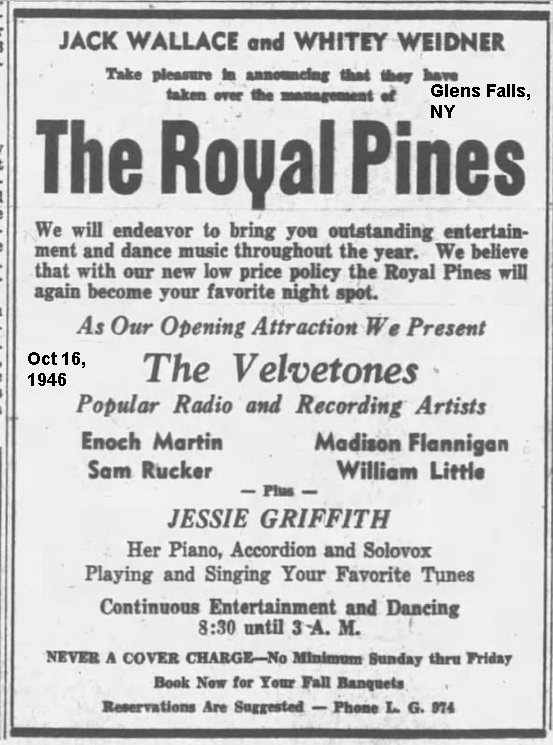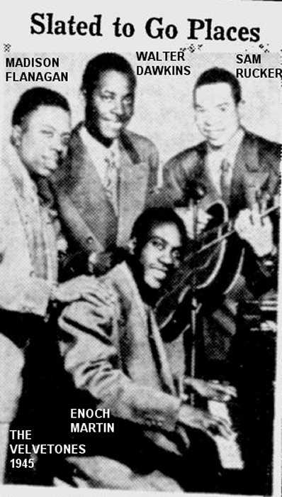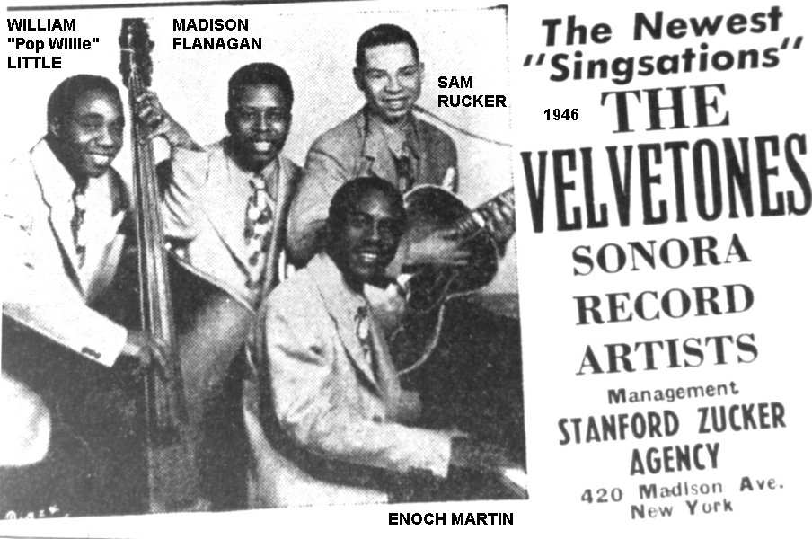 The four of them (Enoch Martin, Sam Rucker, Madison Flannigan [sic], and William Little) were named in an October 1946 ad for the Royal Pines in Glens Falls, New York). A little blurb in the October 14, Post-Star (Glens Falls) called them "radio and recording artists", although I can't find any radio appearances at all. (Note that, at the same time, Bobbie Wilson, Edward Chandler, Swank Thomas, and Leo Porter were the Velvetones who, a New York Age blurb told us, appeared at something called Celebrity Breakfast Sunday.)