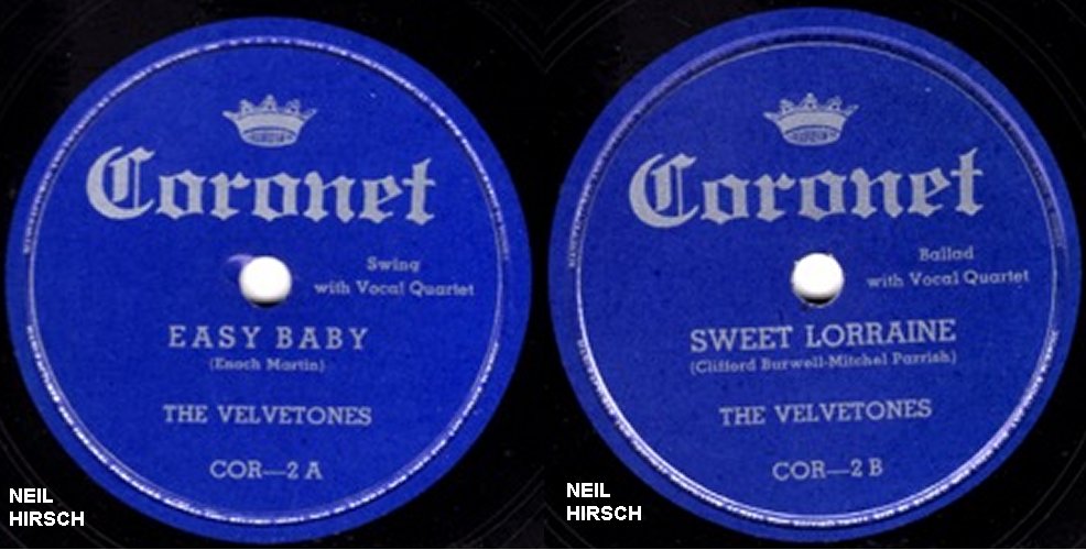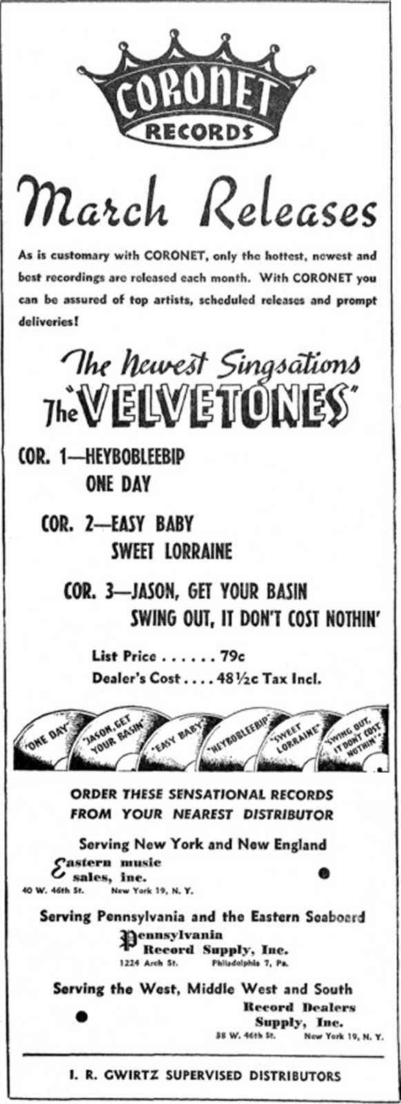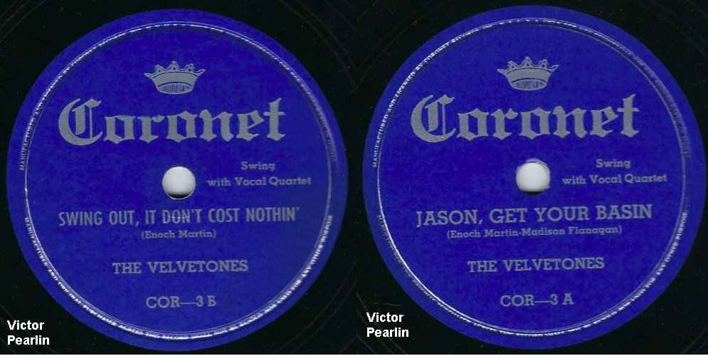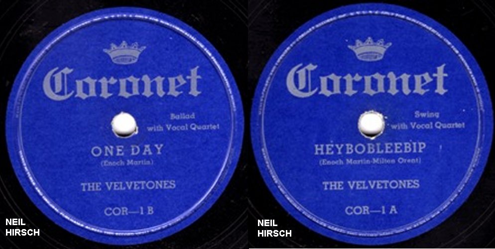 A February 2, 1946 article in the Baltimore Afro-American, tells us that the Velvetones "have cut several late recordings" (whatever that means) for Coronet (at 1650 Broadway in NYC). The titles were "One Day", "Jason, Get Your Basin", "Easy Baby", "Heybobleebip", "Sweet Lorraine", and "Swing Out, It Don't Cost Nothin'".