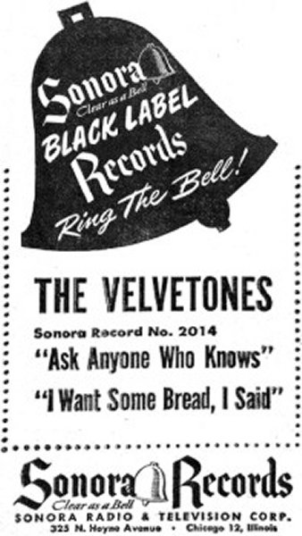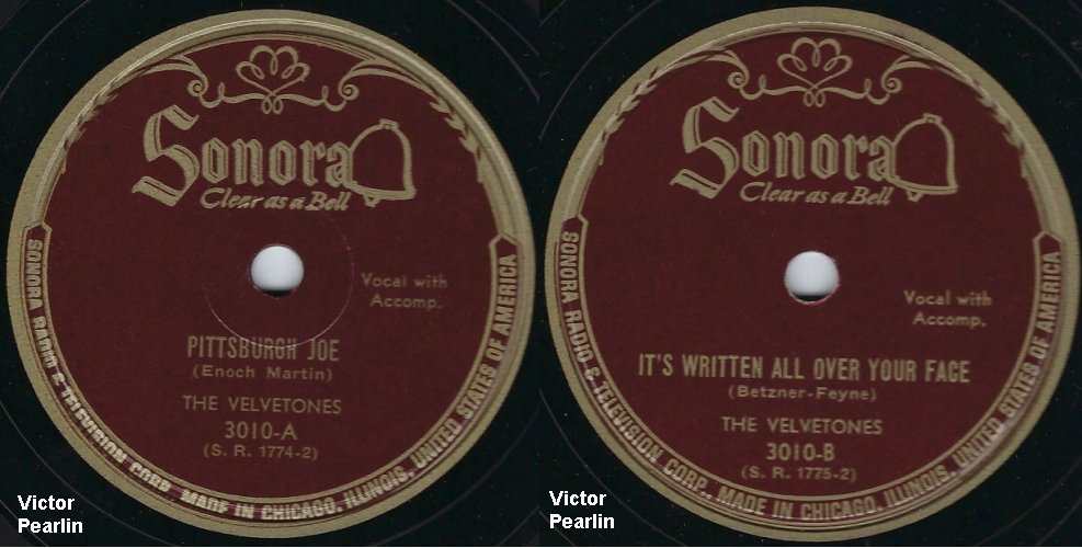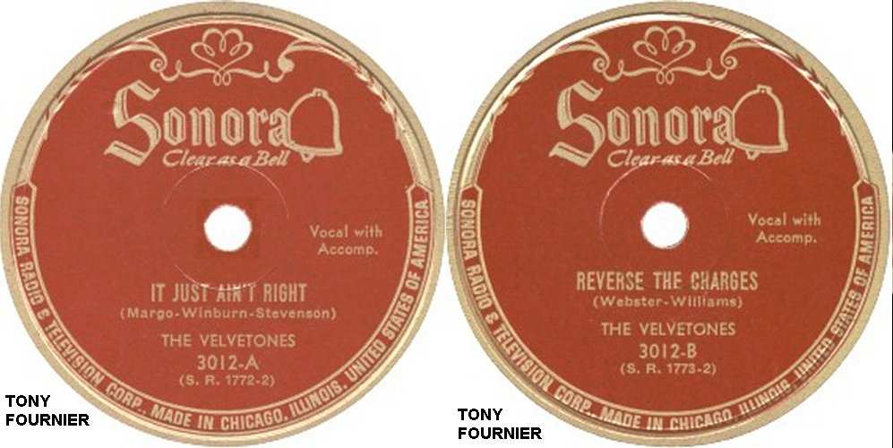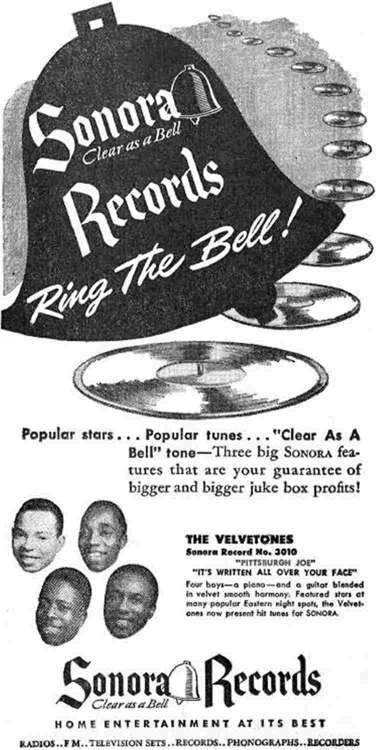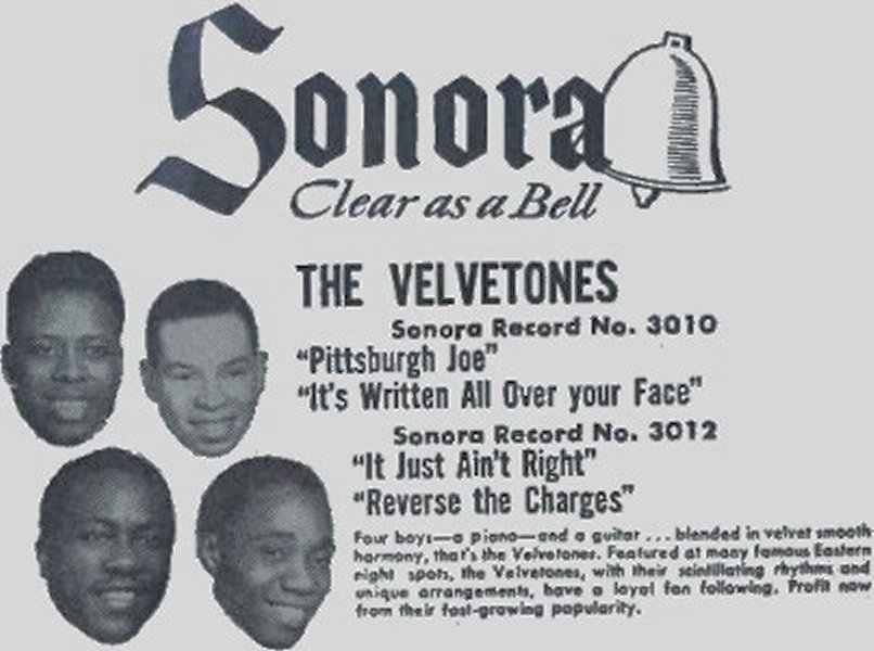 A Sonora Records ad in the June 8, 1946 Billboard mentioned the Velvetones' "Pittsburgh Joe"/"It's Written All Over Your Face". The ad copy reads: "Four boys - a piano - and a guitar blended in velvet smooth harmony. Featured stars at many popular Eastern night spots, the Velvetones now present hit tunes for Sonora." Although not in that ad, the next Sonora release, "It Just Ain't Right", backed with the cute "Reverse The Charges", seems to have come out later that same month (all four titles were listed in Billboard's July 6 Advance Record Releases column). Both records were mentioned in a subsequent Sonora ad (from February 1947) which had some additional text: "Four boys - a piano - and a guitar blended in velvet smooth harmony, that's the Velvetones. Featured at many famous Eastern night spots, the Velvetones, with their scintillating rhythm and unique arrangements, have a loyal fan following. Profit now from their fast-growing popularity."
