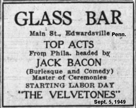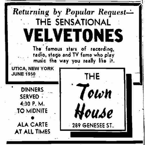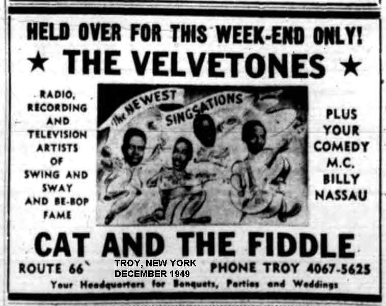 These are the last mentions of the Velvetones: They were back at Jimmy's Glass Bar (Edwardsville, Pennsylvania) starting on September 5, 1949 and continuing through the middle of the month. There was the Town House (Utica, New York) in late October/early November 1949 ("without a doubt the jiviest little combo in the world"). Then, they were at the Cat And The Fiddle (Troy, New York), from December 26 through at least January 7, 1950 (still being advertised as "The Newest Singsations"). Finally, they were back at Utica's Town House in June 1950.