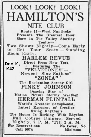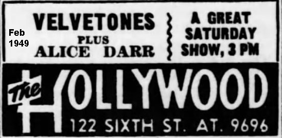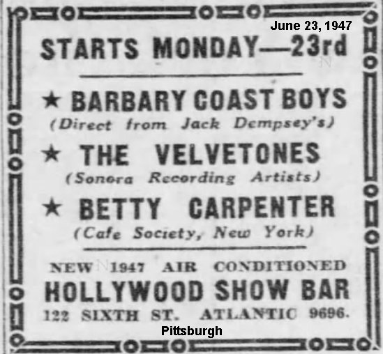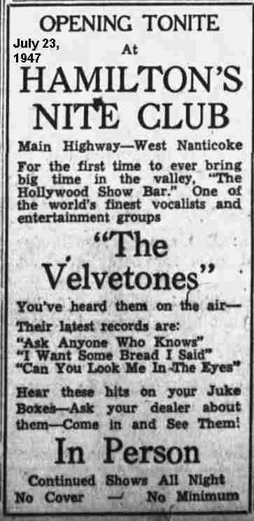 On June 23, 1947, the Velvetones started an engagement at the Hollywood Show Bar in Pittsburgh; they'd remain until July 20. From there, they went to Hamilton's Nite Club (West Nanticoke, Pennsylvania), where they opened on July 23. (The Hamilton's ad mentioned three of the tunes released in April.)