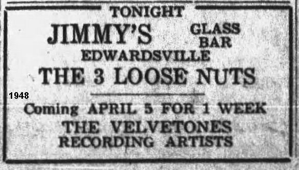 Also in April, the Velvetones opened for a week at Jimmy's Glass Bar in Edwardsville, Pennsylvania; they replaced the 3 Loose Nuts.