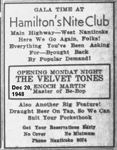 On December 20, they were back at Hamilton's Nite Club in West Nanticoke. I imagine that they were supposed to be there for a week, but something happened. They were due to start at Pittsburgh's Hollywood Show Bar on December 27, but, as the December 25 Pittsburgh Post-Gazette said: "Although originally slated to open on Monday (27), they came in last night (24), Christmas Eve, instead." No explanation was given. The Hamilton ad called Enoch Martin "Master Of Be-Bop".