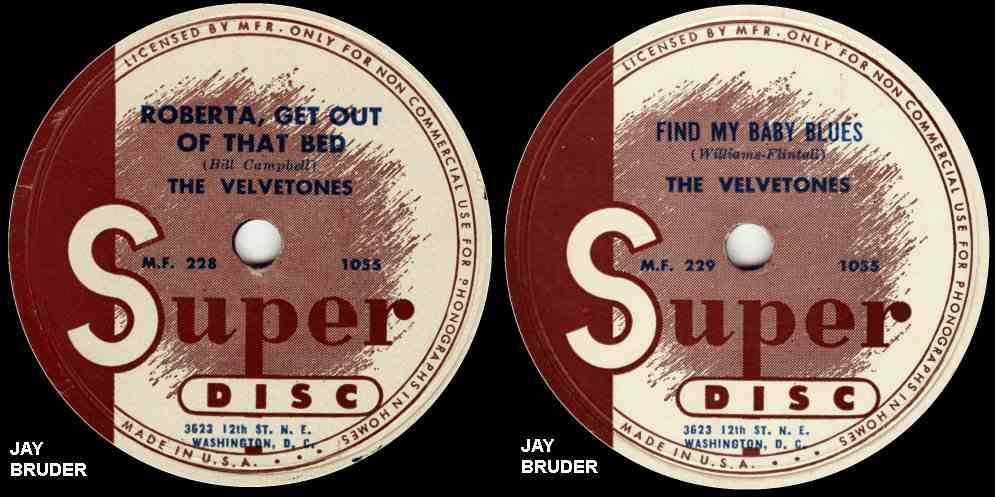 This group had one release for Super Disc, in March 1948: "Roberta, Get Out Of That Bed"/"Find My Baby Blues". Super Disc was originally a New York label, but had relocated to Washington, D.C. in 1947. Soon after the Velvetones release, it was acquired by MGM. Actually, as you'll soon see, anyone that the Velvetones recorded for stood a good chance of being acquired by another company. The record was reviewed in the April 3 Billboard, with "Find My Baby Blues" receiving a super-low 49: "Stock treatment of unexciting blues." The flip did a lot better, garnering a 69: "Boys have fun with this one. Uninhibited chatter and racy lyrics hypo [a trade magazine form of 'hype'] appeal of novelty blues number."