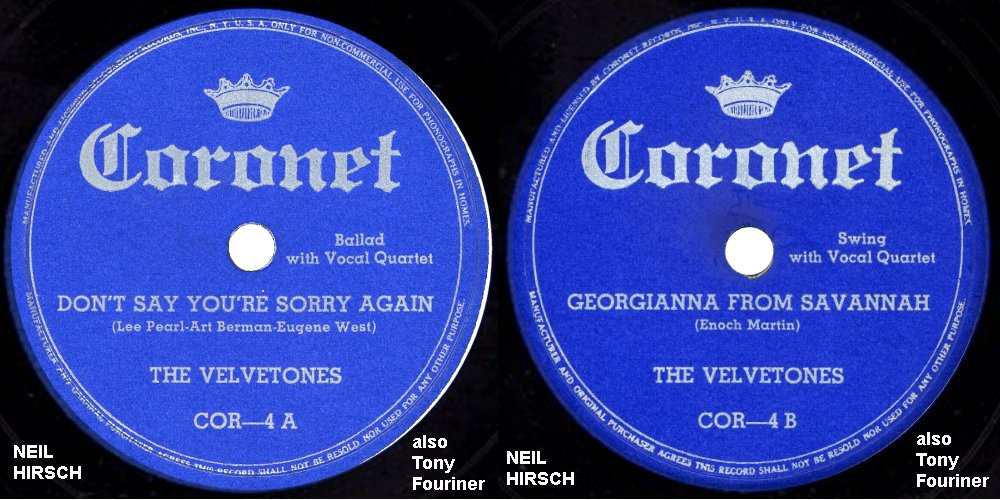 The April 20 Billboard reported that Sonora Records (a Chicago company) had announced the signing of the Velvetones. In spite of this, Coronet released the very pretty "Don't Say You're Sorry Again"/"Georgianna From Savannah" (which was never reviewed). Note that "Don't Say You're Sorry Again" was also recorded by the Rivals (Apollo; 1950) and Dinah Washington (Mercury; 1951).