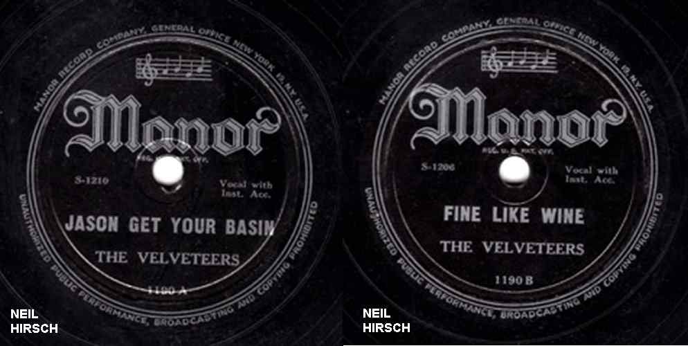 And then, there was a release on Manor in July 1949. I don't know the reason for this, but one side was the Coronet master of "Jason, Get Your Basin". The flip was James Whitcomb & 5 Scamps, doing "Fine Like Wine". Both sides were credited to the "Velveteers". The really amazing thing is that the 5 Scamps side was current, having only been released, on Columbia, the month before. This is a true mystery record.