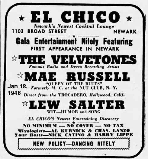 When they played the El Chico Lounge (Newark) in mid-January 1946, the ad proudly trumpeted that they were "Famous Radio And Decca Recording Artists". (I wonder if Decca knew that.)