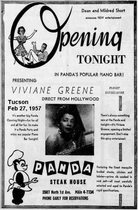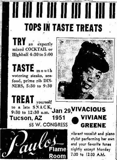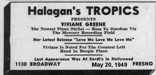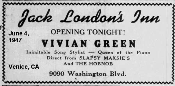 On June 4, 1947, "Vivian Green" opened at Jack London's Inn (Venice, California). She was called "Inimitable Song Stylist - Queen Of The Piano".