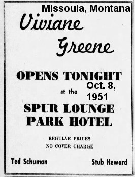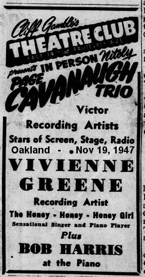 On November 14, 1947, "Vivienne Greene" ("The Honey - Honey - Honey Girl") opened at Cliff Gamble's Theater Club in Oakland, advertised along with the Page Cavanaugh Trio. Said the December 3 Down Beat: