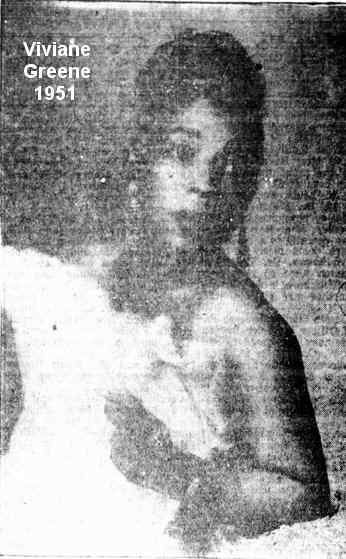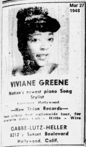HOLLYWOOD. For a young lady who literally stumbled into the entertainment world two years: ago, dynamic Viviane Greene, richly talented pianist who vocally interprets her music, is doing all right for herself. She came to California in 1941 from Prairie View College, on a music scholarship to the University of Southern California. She studied for a spell and later taught music in the Los Angeles City School system. She also served as organist at the East. 28th Street Christian church. [If the 1941 date is correct, it could account for why she wasn't named on her husband's February 1942 draft registration, since he was still in Houston. However, we know she was in Houston in April 1942, when she gave birth to her daughter, Barbara Ann.]