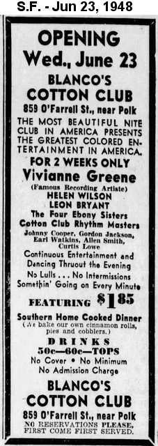 Viviane was supposed to open at the Cotton Club in San Francisco on June 23, but didn't. The June 28, 1948 San Francisco Examiner explained: