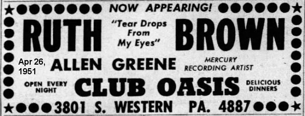 Miss Greene, recently recovered from serious injuries sustained when her new Oldsmobile sedan was demolished in an accident in Hollywood, moved into the Brass Rail here [Glendale, California] this week for a four-week engagement where she will share the spotlight with Pete Johnson. [With Johnson being one of the greatest boogie-woogie pianists ever, that must have been a real thrill for piano lovers.]