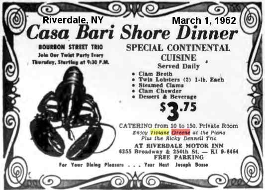 Nothing more for nearly a year, until the December 17, 1964 New York Daily News said: "Pianist Vivian Greene opens a month's engagement at Gatsby's tomorrow."