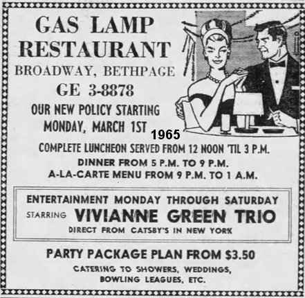 On March 1, 1965, the Viviane Green Trio started at the Gas Lamp Restaurant in Bethpage, Long Island, New York. You know how I get with the phrase "direct from", but when the ad said "Direct from Gatsby's in New York", for a change it was the truth.