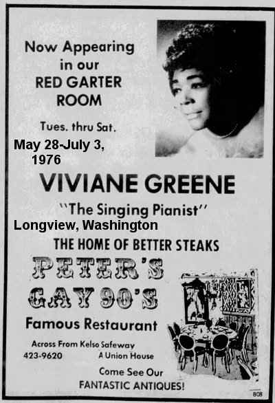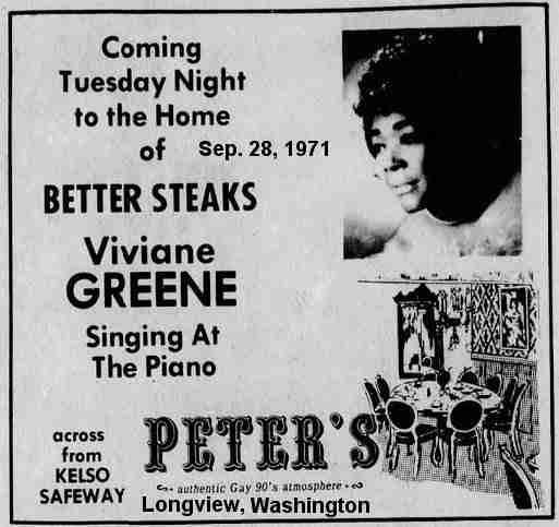The Centralia, Washington Daily Chronicle of February 17, 1972 reported that Viviane Greene, of Oakland, was a guest speaker at a music teachers association luncheon. At the time, she was appearing at Centralia's Hallmark Inn. At the time, she announced plans to open a music conservatory in Oakland. With her at the luncheon was daughter Susaye, who was with Ray Charles' Raelettes at the time. [In 1976, Susaye would join the Supremes and was with them for their last year.]
