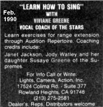Another enterprise: a February 1990 ad said that Viviane Greene ("vocal coach of the stars") will teach you how to sing. [There's no doubt in my mind that, had I shown up, she would have slammed the door in my face and gone out of business immediately. Even my shower threatens to leave home.] Her credits, the ad said, included Janet Jackson, Jody Watley, and Susaye Greene.