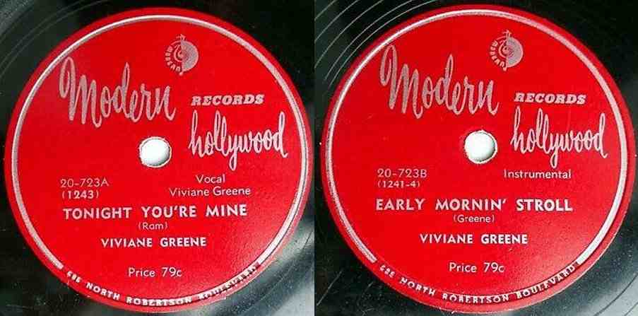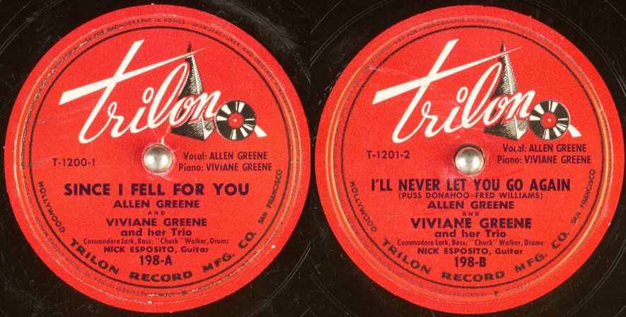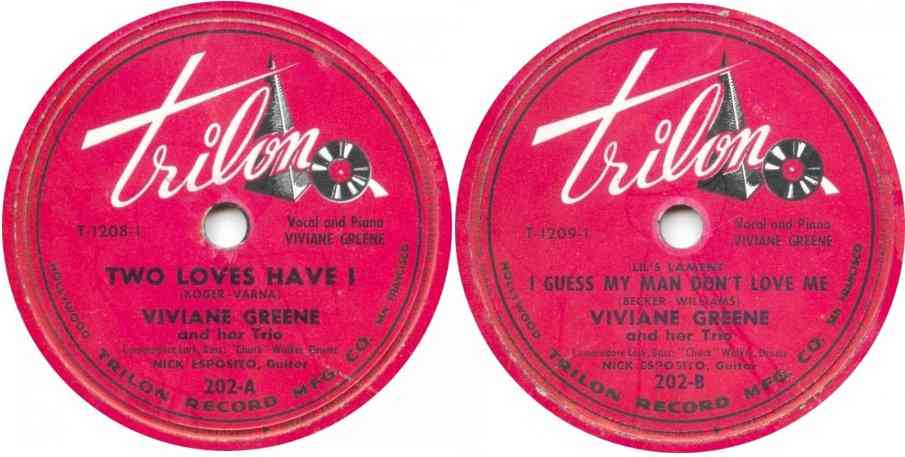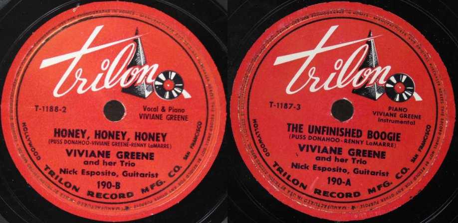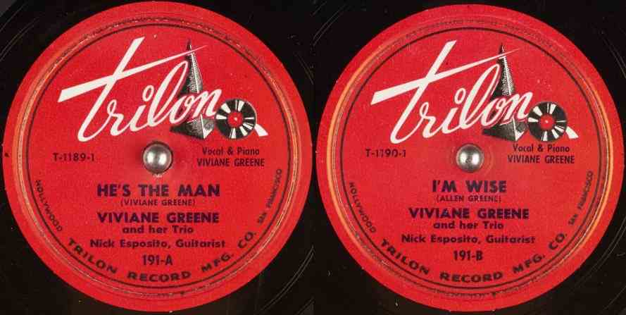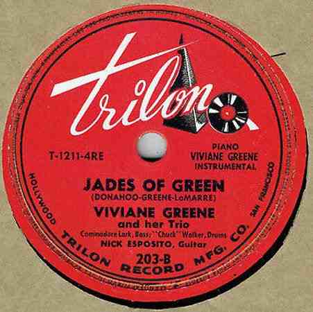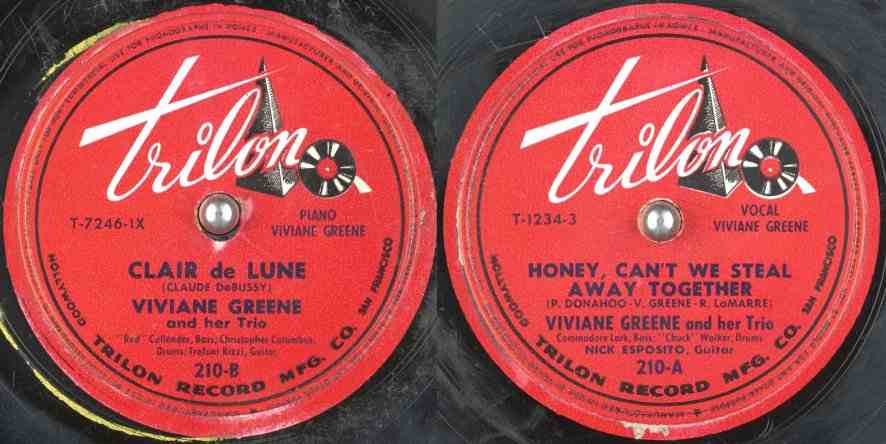 Trilon was an Oakland company, owned by Renny LaMarre. Viviane recorded for them with "her Trio": Commodore Lark (bass), Chuck Walker (drums), and Nick Esposito (guitar). They were probably brought in for the Trilon sessions. Esposito was a bandleader whose "Hot Quintet" was advertised in the San Francisco area during this period; there were never any advertisements at this time for a Viviane Greene Trio.