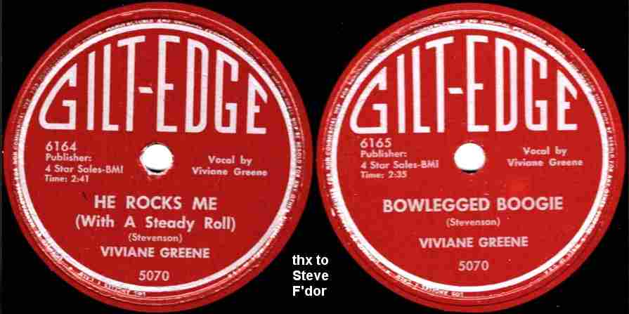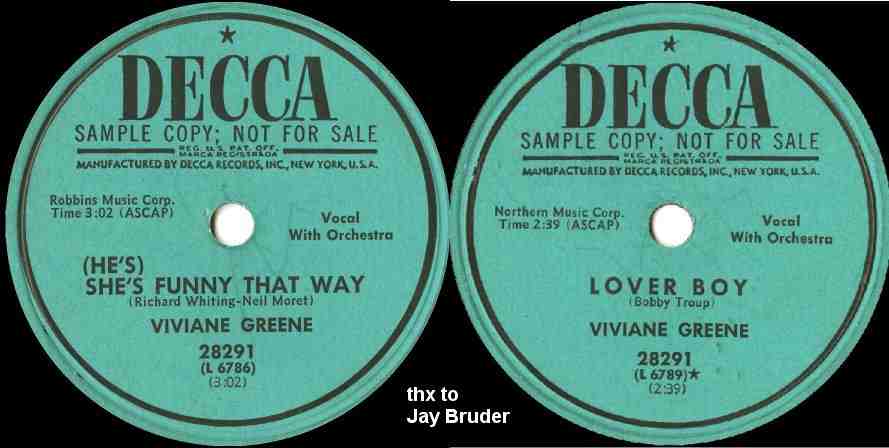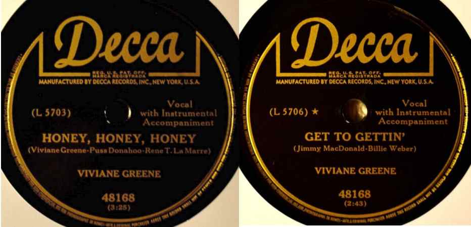 Viviane Greene wrote and recorded a song most of you know: "Honey, Honey, Honey", which engendered cover versions by Hadda Brooks (Modern; 48), Marion Abernathy (King; 48), Martha Davis (Decca; 48), Shirley Moore with the Cats & The Fiddle (Manor; 48), the Ah-Moors (Rainbow; 48), and Ray Charles (Down Beat; 49). However, in spite of how popular it was with singers, no version ever made the charts.
