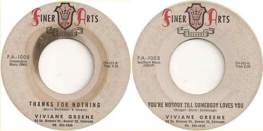 Cash Box: Pair of flavorful and colorful sides for race locations are these offered in subtle tones by the capable Viviane Greene. Weaving in slow setting to the magic wordage of "Honey, Honey, Honey", the thrush picks up the lead to come thru with some soft stuff that shines. The beat here plus the gal's tricks worm their way into you and make you wanna come back for more. The flip shows Viviane at the ivories with "The Unfinished Boogie" spilling out. Where they go for this brand of stuff, and that covers lots of territory, they'll hold still for this.